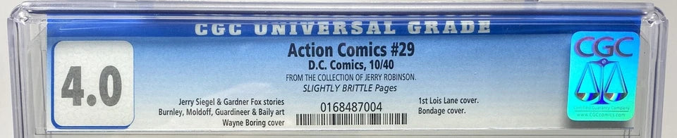 ACTION COMICS #29 - 1940 - CGC 4.0 - 1ST LOIS LANE CV JERRY ROBINSON COLLECTION